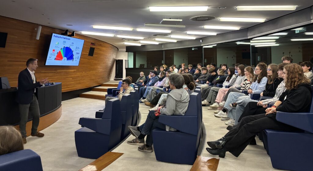 Nach einer Einführung über den demokratischen Gedanken bei der Gründung der EU und die Anzahl bzw. die Anordnung der Abgeordneten im Plenarsaal wurde uns die Sprachenvielfalt Europas vor Augen geführt. Ähnlich wie der Heilige Geist lösen die Simultandolmetscher in Straßburg die babylonische Sprachverwirrung und sorgen dafür, dass alle Abgeordneten des Europaparlaments in den 24 Amtssprachen der EU debattieren und sich trotzdem verstehen können. Auch erklärte uns der Referent des Besucherservice sehr anschaulich, wie schwierig die deutsche Sprache für Simultandolmetscher ist, da das Verb im Deutschen erst am Satzende steht und ein Satz somit lange „zwischengespeichert“ werden muss, bevor er tatsächlich übersetzt werden kann. Leider verpassten wir knapp die Abstimmung über die Bezeichnung Veggieburger und lauschten den deutschen, französischen, österreichischen, finnischen und spanischen Abgeordneten zum Thema Rücknahme des Verbots der Verbrennungsmotoren.