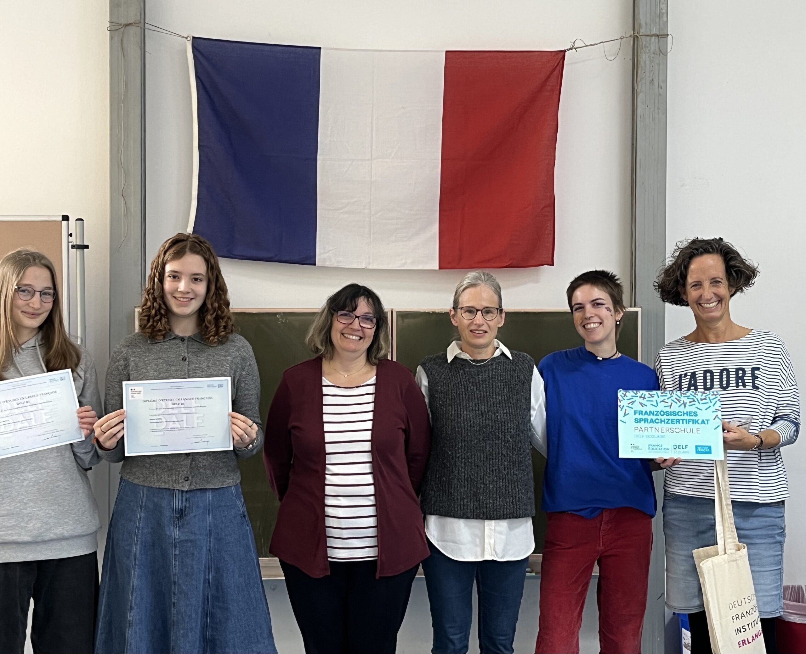am Freitag, den 31.10.2025 fand die Übergabe unserer DELF-Diplome am Riemenschneider-Gymnasium statt. Hierzu kamen eine Vertreterin von France-Mobil, Mme Pauline Olivier sowie Mme Lahner, die das Deutsch-Französische Institut Erlangen leitet, an unsere Schule. Wir empfingen unsere Gäste im Klassenzimmer der Klasse 11a zusammen mit drei Schülerinnen der 10. Klasse, die dieses Jahr ihr DELF-Diplom ablegen werden, Frau Eyrich, Frau Baier und unserem Schulleiter Herrn Rottenbacher.