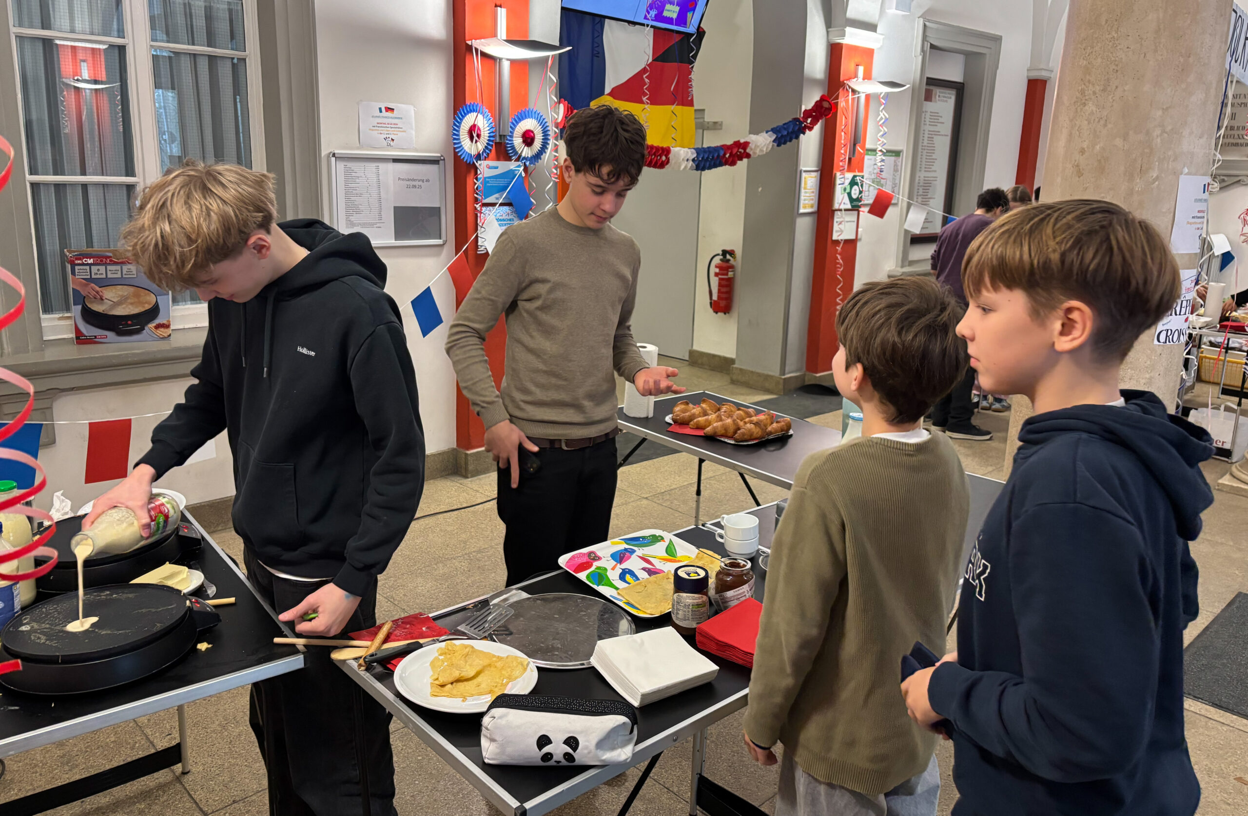 Wir am Riemenschneider-Gymnasium haben dieses Jahr den deutsch-französischen Tag am 2. Februar gefeiert. An der Ausrichtung waren zahlreiche Französischschülerinnen und -schüler beteiligt. Die Schülerinnen und Schüler aus der 10a hatten für die 6. Klassen in verschiedenen Räumen zahlreiche Spiele vorbereitet, mit denen sie die Sechstklässler spielerisch mit der französischen Sprache und kulturellen Besonderheiten des Nachbarlandes vertraut machten. Für das leibliche Wohl sorgten die Klasse 9a und die 11. Klassen. Während erstere in der 1. Pause köstliche Crêpes anboten, wurde die Schülerinnen und Schüler unserer Schule in der 2. Pause mit französischen Baguettes versorgt. Die liebevolle deutsch-französische Dekoration der Schule, die die Kolleginnen der Französisch-Fachschaft mit den Schülerinnen und Schülern im Vorfeld im Schulhaus anbrachten, war prächtig. All diese Aktionen am RIG zeigen die große Wertschätzung, mit der die Französisch lernenden Schülerinnen und Schüler unserer Schule dem Nachbarland begegnen. Ein bedeutsamer Tag, der 22. Januar, der vor allem in unseren Tagen ein wichtiges Zeichen für den Frieden und die Völkerverständigung bedeutet.