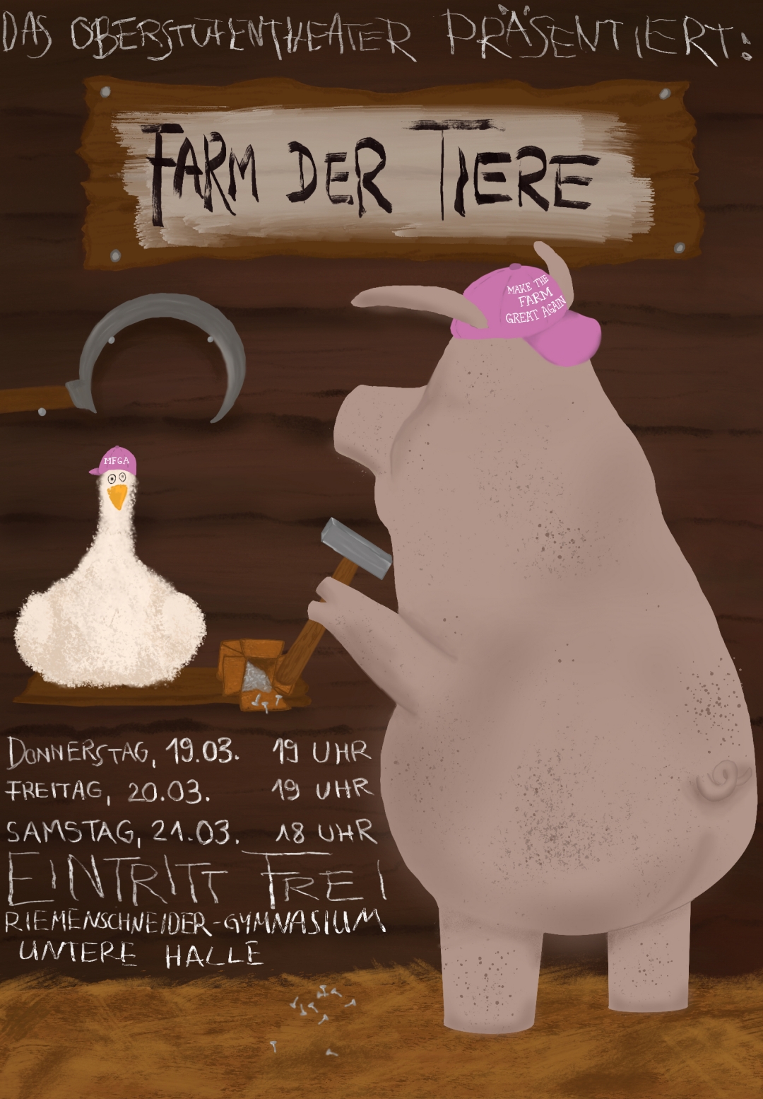 zu der Abschlussproduktion des Oberstufentheaters möchten wir Sie und euch herzlich einladen. Gespielt wird „Farm der Tiere“ nach dem Klassiker von George Orwell.